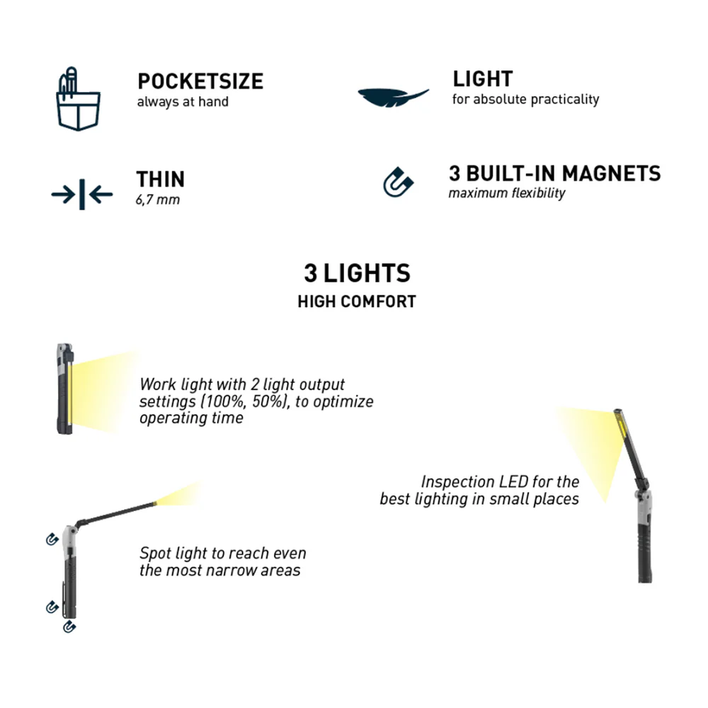 Ultra-thin (6.7mm), lightweight (81g), and pocket-sized for ultimate portability. Features three lighting modes: a 280-lumen work light (100%/50%), a spotlight for narrow areas, and an inspection LED. 3 built-in magnets enable hands-free use. 1100mAh battery lasts 3 hours and recharges quickly. Bright, compact, and perfect for professionals!